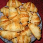 Découper la pâte feuilletée en triangle 8 part env. ou couper la de la façon suivante: pour des plus petits croissants couper la pâte en trois dans le sens de la longueur se qui donneras trois partie , prenez chaque partie pour y faire des triangles puis au milieu déposez une c.c de la farce sur le côté le plus large, enrouler les croissants de la largueur vers la pointe en ferment les bords des deux côtés, puis les déposer sur la plaque, badigeonner tout les croissants de jaune d’œuf vous aurez-ainsi obtenu 26-30 petits bon croissants.