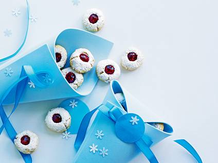 - Préchauffer le four à 150 °C. Remplir les cavités avec la confiture ou la gelée. Cuire les biscuits au milieu du four durant env. 20 min. Encore chauds, les saupoudrer généreusement de sucre glace.