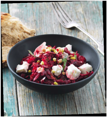 Pour la sauce, râper la moitié du zeste de l’orange et presser tout le jus. Mélanger le tout avec l’huile, assaisonner. Râper les betteraves et l’oignon à la râpe à röstis directement dans la sauce. Ciseler la coriandre ou le persil et l’ajouter à la salade. Mélanger, assaisonner,émietter la Féta par-dessus et garnir avec les graines germées. Servir avec du pain complet.